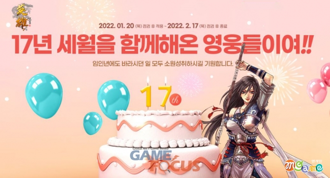 또한 내달 17일까지 풍성한 기념 이벤트가 진행된다. 이벤트 기간 동안 접속 3시간마다 특별한 아이템을 얻을 수 있는 임인년 축하 상자 행낭이 자동 지급되며, 게임 내 위치한 17주년 케이크를 배경으로 문파원들과 찍은 스크린샷을 등록하면 추첨을 통해 특별한 혜택을 제공한다.