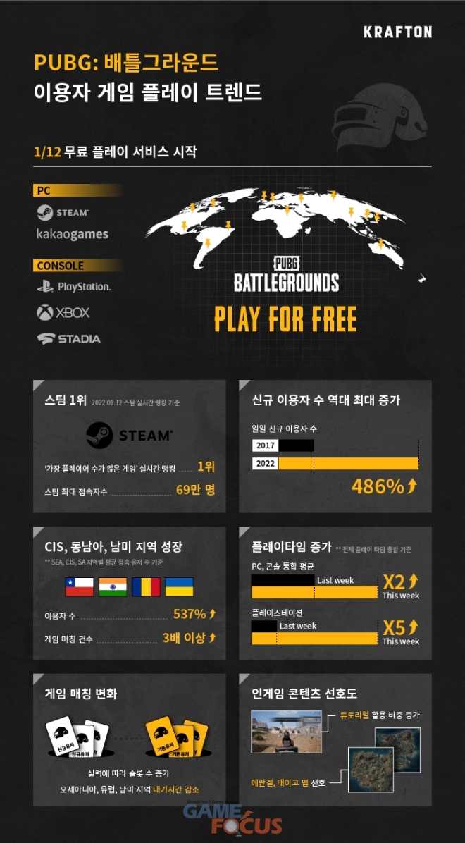 ㈜크래프톤(대표 김창한)의 ‘PUBG: 배틀그라운드(PUBG: BATTLEGROUNDS, 이하 배틀그라운드)’가 무료 플레이 서비스 시작 후 집계된 데이터를 바탕으로 ‘이용자 게임 플레이' 트렌드를 공개했다.