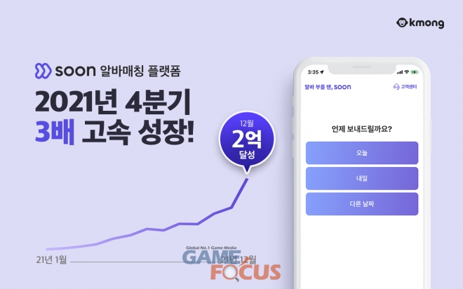 프리랜서 마켓 플랫폼 (주)크몽(대표 박현호)은 24일, 자사가 운영 중인 간편 알바 매칭 서비스 쑨(soon)이 지난해 4분기에만 300% 성장하며 월 거래액 2억 원을 돌파했다고 밝혔다.