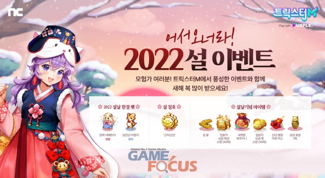 '트릭스터M'은 2월 9일까지 '어서오너라 2022 설 이벤트'를 실시한다. 이용자는 까발라 섬 전 지역과 이벤트 던전 '새해의 대지'에서 사냥과 발굴을 통해 '설 윷'을 획득할 수 있다. '설 윷'은 NPC를 통해 '임인년 어흥이 펫 소환(희귀), 설 칭호 주머니, 별희의 신년 별점 의뢰 박스(이벤트), 알파벳 아이템' 등 각종 아이템으로 교환 가능하다. 해당 아이템을 통한 추가 혜택도 즐길 수 있다. '알파벳 아이템'을 아카데미에 등록한 이용자는 자격증 효과를 얻는다. '별희의 신년 별점 의뢰 박스(이벤트)'를 열어 의뢰 퀘스트를 수행하면 다양한 보상과 버프를 받을 수 있다.
