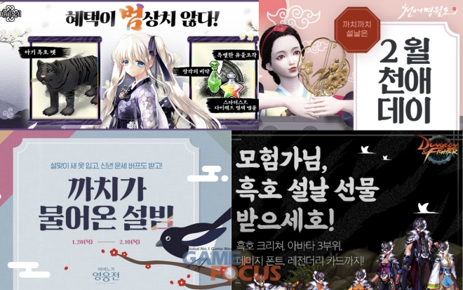 '마비노기영웅전'에서는 2월 10일까지 매일 게임 내 일일미션 완수 시 '까치가 물어온 복주머니' 아이템을 지급한다. 해당 아이템을 사용하면 16종의 아바타 중 1종을 선택해 24시간동안 착용할 수 있는 '까치가 물어온 설빔 선택상자'와 캐릭터 능력치를 향상시키는 스크롤 1종을 얻을 수 있는 '까치 도사의 이상한 부적', 전용 상점에서 다양한 게임아이템으로 교환 가능한 '까치쿠폰'을 비롯해 전투 시 생명력을 회복할 수 있는 '찹쌀 떡국' 등을 얻을 수 있다.