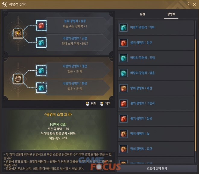 '유물'은 사냥터에서 획득 가능하며, '광명석'은 채집과 사냥을 통해 얻은 '광명석 원석'을 연금술로 연성해 만들 수 있다. 현재 가능한 100여 개의 조합식에 특정 기술 쿨타임 감소, 밤 시간대 공격력 상승 등 독특한 효과도 추가할 계획이다.