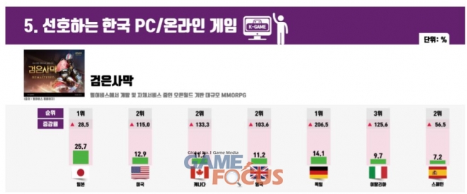 '선호하는 한국 게임' 조사에서 검은사막은 일본 1위, 독일 1위, 영국 2위, 스페인 2위, 이탈리아 3위, 미국 2위, 캐나다 2위, 브라질 2위 등 9개 국가에서 TOP3 안에 들었다.