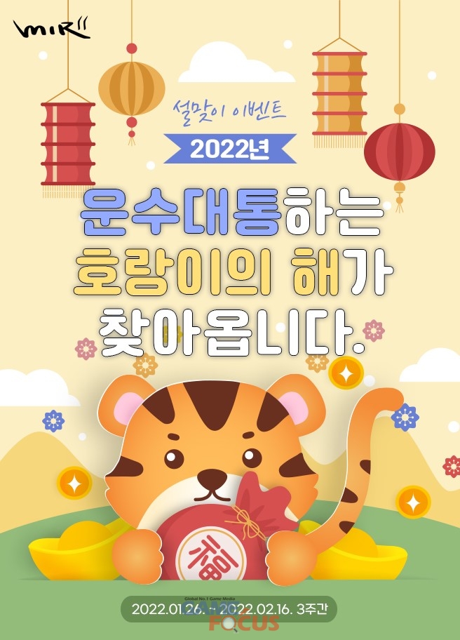 온라인게임 '미르의 전설3'에서는 2월 16일(수)까지 시공던전의 시작지점 주변에서 등장하는 임인년호랑이를 처치하면 확률에 따라 미로뽑기 이벤트 참여 시 사용할 수 있는 임인년 쿠폰을 얻을 수 있다. 비천현 NPC 신우를 찾아가면 마비의 반지 등 다양한 보상에 도전할 수 있는 임인년 미로뽑기에 참여할 수 있다.