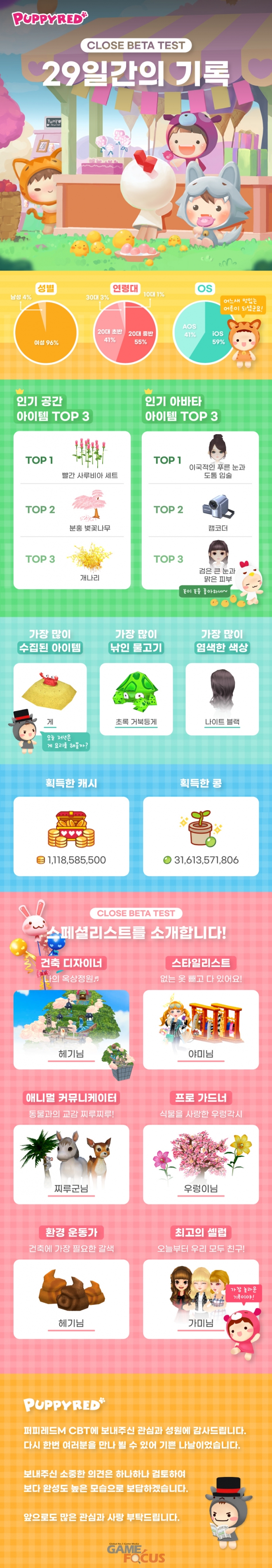 성별과 연령별 데이터의 경우 개발사를 깜짝 놀라게 할 만한 수치가 곳곳에서 포착되었다. 29일간 접속한 유저 통계에 따르면 여성 유저가 무려 96%를 차지했으며, 남성 유저층은 4%를 기록하는 데 그쳤다. 이에 대해 퍼피레드 측은 "여성 유저와의 적극적인 커뮤니티를 희망하는 남성 유저들 사이에서 입소문이 날 경우 관련 수치는 단계적으로 정비례할 것으로 기대하고 있다"고 밝혔다.