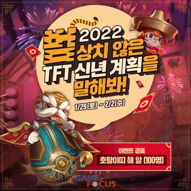 TFT는 1월 29일부터 2월 2일까지 공식 페이스북에서 “2022 범상치 않은 TFT 신년 계획을 말해봐” 이벤트를 진행한다. 이벤트 공지글에 신년 TFT 계획을 댓글로 달아 공유하는 방식으로, 참가자 중 100명을 추첨해 '호랑이띠 해 알' 1개를 증정한다.