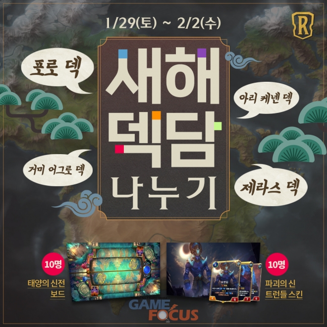 LoR의 공식 페이스북에서도 '새해 덱담 나누기' 이벤트가 진행된다. 이벤트 기간은 1월 29일부터 2월 2일까지이며, 이벤트 안내문에 '룬테라에서 장수할 것 같은 나의 최애 덱'을 댓글로 달면 20명을 추첨해 '태양의 신전 보드'와 '파괴의 신 트런들 스킨'을 각 10명씩 증정한다.