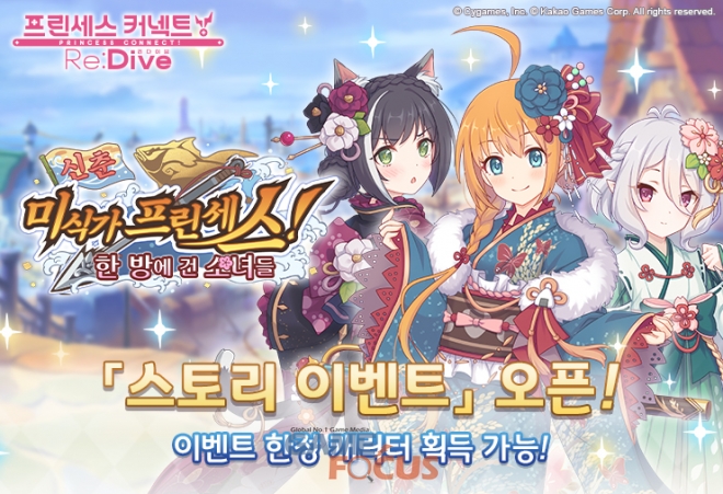 이와 더불어, 오는 2월 11일까지 신규 스토리 이벤트 '신춘 미식가 프린세스! 한 방에 건 소녀들'을 진행한다. 이번 스토리 이벤트에서는 '미식전' 길드 소속의 '페코린느', '콧코로', '캬루'와 '무이미', '네네카'를 중심으로 한 특별한 스토리를 감상할 수 있다. 또한 이벤트 퀘스트와 이벤트 보스 토벌을 통해 '무이미(새해)'와 '캬루'의 메모리 피스도 얻을 수 있으며, 경험치를 1.5배로 추가 획득하는 캠페인에 참여할 수 있다.
