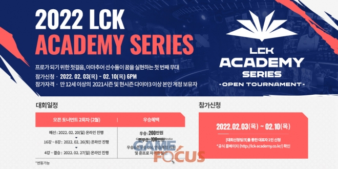 아울러 오는 10일(목) 오후 6시까지 LCK 아카데미 시리즈 오픈토너먼트 2회차 참가신청이 진행된다. 참가자격은 만 12세 이상 2021시즌 및 2022시즌 다이아3 이상인 본인 계정을 소유한자로, 5명이 팀을 이뤄서 신청하면 된다. 단, 최근 6개월 내에 LCK 및 LCK 챌린저스 리그, 타 지역 프로리그에 출전할 이력이 있는 경우에는 참가가 제한된다. 참가신청은 별도의 링크를 통해 가능하며, 신규 참가자에게는 문화상품권이, 오픈토너먼트 3회 이상 참가자에게는 게이밍 마우스가 증정된다.