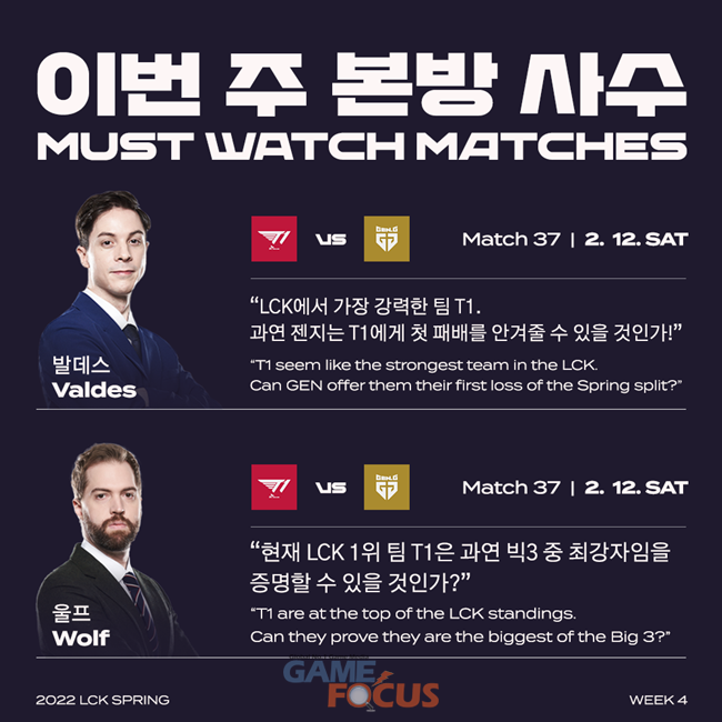 모두가 예상한 것처럼 2022 LCK 스프링 4주 차에서는 T1과 젠지의 경기가 '금주의 경기(Match Of The Week)'로 꼽혔다. 4주 차에 꼭 봐야 하는 경기를 꼽아 달라는 요청에 해설자들 네 명 모두 T1과 젠지의 대결을 선택했다.