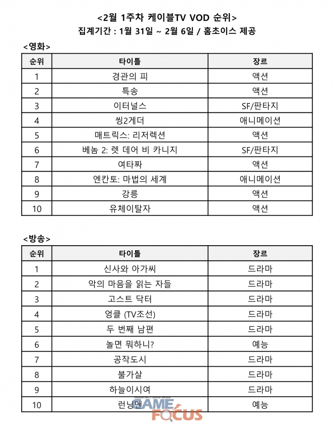 10일 (주)홈초이스가 발표한 LG헬로비전, Btv 케이블, 딜라이브, CMB, HCN 등 전국 케이블TV '1월 4주차 영화 · 방송 VOD 순위'에 따르면, '경관의 피'가 영화 VOD 1위를 기록했다.