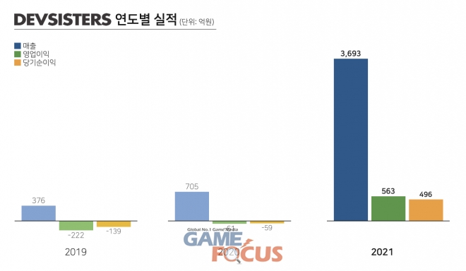 데브시스터즈는 2021년 연결기준 매출 3693억 원, 영업이익 563억 원, 당기순이익 496억 원을 달성했다고 14일 밝혔다. 매출은 전년 동기대비 424% 급증했으며, 영업이익과 당기순이익은 흑자전환에 성공했다.