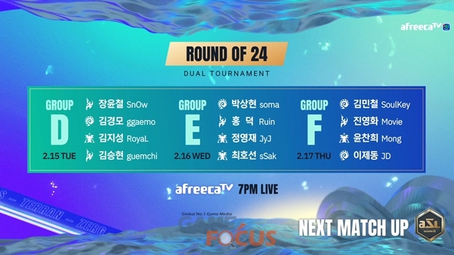 17일 오후 7시 마지막으로 진행되는 24강 F조 경기에선 김민철(Z)와 진영화(P)가 먼저 맞붙는다. '마왕' 조기석을 뚫고 24강에 안착한 진영화가 높은 수비력을 자랑하는 '철벽' 김민철과 과연 어떤 경기를 펼칠지가 기대된다. 이어지는 경기에선 전역 후 2년 6개월 만에 전승으로 예선을 뚫고 올라온 이제동(Z)과 윤찬희(T)의 경기가 진행된다. 오랜만에 공식 경기에 모습을 보이는 이제동의 경기에 많은 유저들의 관심이 모이고 있다.