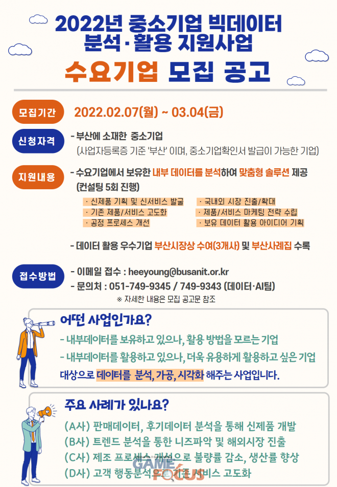 부산시(시장 박형준)와 부산정보산업진흥원(원장 정문섭)은 지역의 빅데이터 산업 활성화 및 기업의 데이터 활용 자생력 강화를 위한 ‘중소기업 빅데이터 분석·활용 지원사업’의 참여기업을 모집한다고 16일 밝혔다.