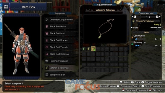 '검은띠 시리즈' 방어구 세트는 초반 퀘스트를 진행할 때 높은 방어력을 제공할뿐만 아니라 공격력 증가, 체력 회복량 상승 및 몬스터의 포효의 영향을 감소시켜준다. 본 방어구 세트는 덧입는 장비로도 입수할 수 있다. 모든 파츠를 장착하였을 때의 총 방어력은 150이다. (최대 업그레이드 시 180)
