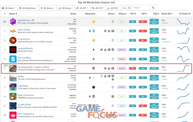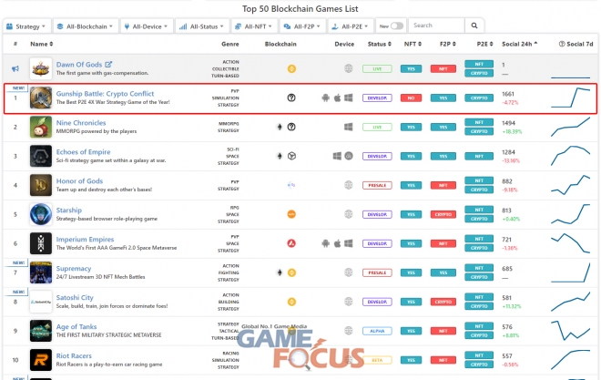 조이시티(대표 조성원)가 자사의 신작 P2E 게임 '건쉽배틀: 크립토 컨플릭트'가 P2E 게임 랭킹 사이트 'playtoearn.net'에서 전략 카테고리 1위를 기록했다고 18일 밝혔다.