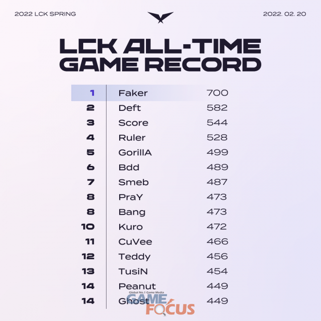 팀을 대표하는 플레이어인 '페이커' 이상혁도 LCK의 역사에 길이 남을 위업을 달성했다. 2013년 스프링을 통해 데뷔한 이상혁은 2022년까지 10년 동안 선수 생활을 이어가면서 가장 먼저 700 경기 출전 기록을 세웠다. 2위인 DRX의 '데프트' 김혁규와 100 경기 이상 차이가 나기 때문에 이상혁의 기록은 당분간 깨지기 어려울 것으로 보인다.
