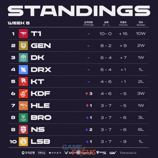 광동 프릭스가 3연승으로 순위를 끌어 올린 반면, 하위권 팀들은 물고 물리거나 연패에 빠지면서 한화생명e스포츠, 프레딧 브리온, 농심 레드포스, 리브 샌드박스는 모두 3승7패로 승패가 같아졌고 세트 득실에 따라 순위가 결정됐다.