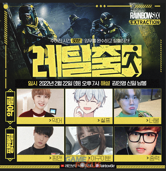 유비소프트 엔터테인먼트(Ubisoft Entertainment)가 자사의 협동 전술 FPS '레인보우 식스 익스트랙션'의 인플루언서 경쟁 콘텐츠인 '레탈출'을 22일 저녁 7시에 진행한다.