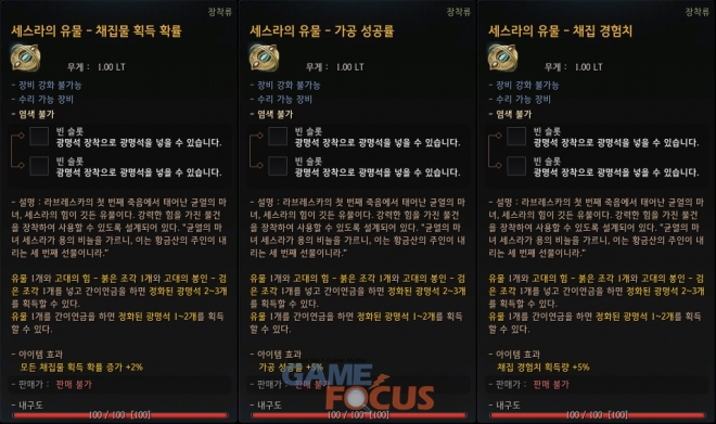 이용자는 생활 콘텐츠 수행 시 신규 유물 '세스라의 유물'과 '풀의 광명석'을 얻을 수 있다. '풀의 광명석'을 속성별로 다양하게 조합해 생활 숙련도 및 생활 경험치, 채집량 증가 등 세트 효과를 받을 수 있다. 펄어비스는 검은사막 이용자를 위한 생활 콘텐츠 수익 및 접근성을 개선하고 있다.
