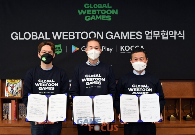 네이버웹툰은 구글 플레이, 한국콘텐츠진흥원과 웹툰 IP 기반의 게임화 및 글로벌 진출 지원을 위한 '글로벌 웹툰 게임스(GLOBAL WEBTOON GAMES)' 프로젝트 업무협약(MOU)을 체결했다고 밝혔다.