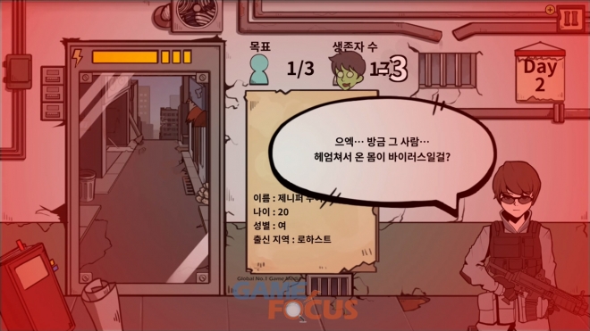 플레이어는 민간 대피소에 찾아온 시민의 프로필을 바탕으로 다양한 질문을 하여 감염되어 있는지 아닌지를 판별해야 한다.