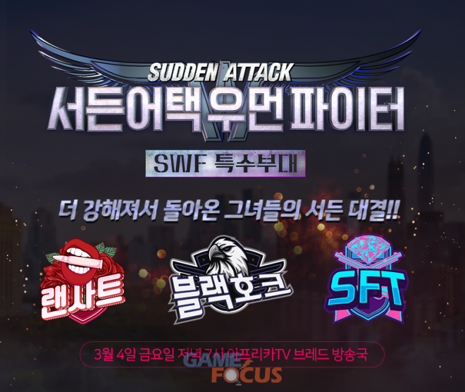 넥슨(대표 이정헌)이 온라인 FPS게임 '서든어택'의 여성 BJ 이벤트 매치 '서든어택 우먼 파이터 (이하 '서우파')'를 오는 3월 4일 개최한다.