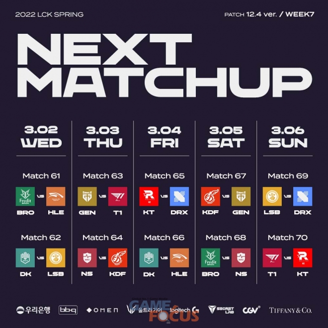 2022 LCK 스프링 7주차는 아프리카TV, 네이버 e스포츠&게임, LCK 공식 트위치 채널 등 온라인 플랫폼을 비롯해 아프리카TV 케이블 채널(딜라이브 154번, 올레TV 129번, Btv 136번, U+tv120번, 서경방송 256번)을 통해 생중계된다.