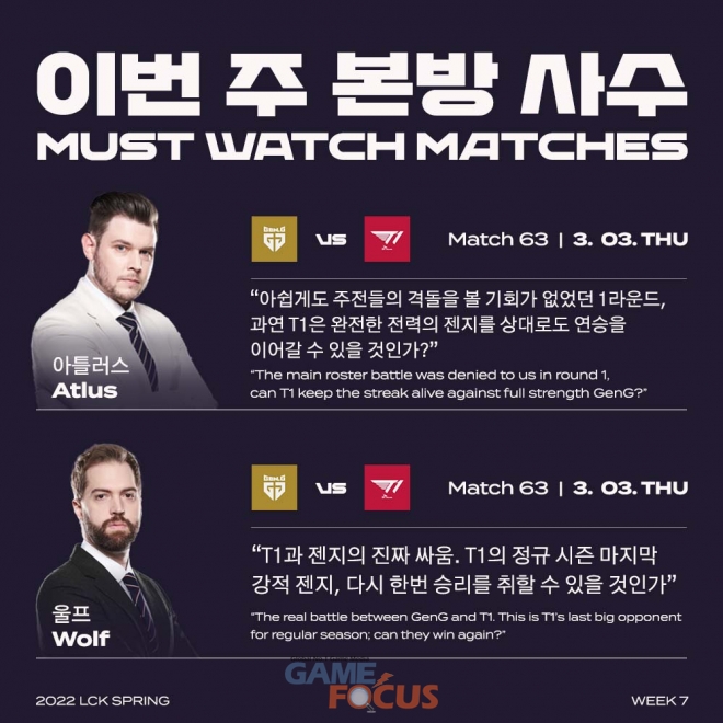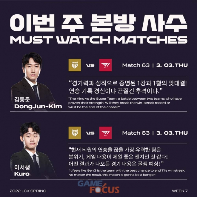 LCK 중계진들도 T1과 젠지의 경기를 반드시 챙겨봐야 할 매치업으로 선정했다. 김동준 해설 위원은 "경기력과 성적으로 이미 증명된 두 팀의 대결이기에 꼭 봐야 한다"라면서 "12연승을 달리고 있는 T1이 기록 경신을 눈 앞에 두고 있고 젠지는 이를 저지하면서 추격을 이어가야 하기에 중요한 경기"라고 말했다.