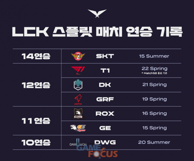 T1은 2022 LCK 스프링 개막 이후 한 번도 패하지 않으면서 12전 전승을 이어가고 있다. 2015년 LCK가 정규 리그를 더블 라운드 로빈 방식으로 바꾼 이후 단일 스플릿 연속 경기 승리 기록은 2015년 서머에서 SK텔레콤 T1이 세운 14경기 연승이다. 당시 SK텔레콤은 5월 23일 스베누 소닉붐과의 경기에서 2대0으로 승리한 이후 7월 24일 CJ 엔투스에게 1대2로 패하기 전까지 14연승을 이어갔고 아직까지 단일 스플릿 최다 연승 기록으로 남아 있다.