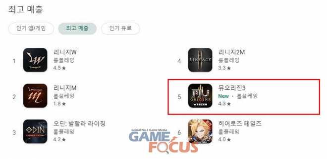 웹젠(대표 김태영)의 신작 모바일 MMORPG '뮤오리진3(MU Origin 3)'가 구글 플레이 스토어 매출순위 최상위권에 안착했다.