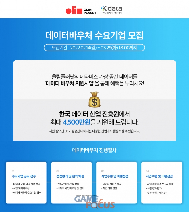 올림플래닛의 데이터 바우처 지원 수요기업으로 선정될 경우 올림플래닛의 차별화된 기술을 지원 받아 다양한 산업에서 기업형 쇼룸, 갤러리, 박람회 등의 메타버스 공간을 도입할 수 있게 된다. 또, 정부 지원금으로 비용 부담을 최소화할 수 있어 수요기업에게는 좋은 기회가 될 수 있다. 데이터 바우처 수요기업 신청은 3월 29일 오후 6시까지 데이터바우처 사업관리시스템에서 진행 가능하다.