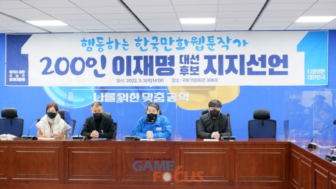 '행동하는 한국만화웹툰작가' 224인은 지지 선언을 통해 “이재명 후보는 만화웹툰인들의 현황을 이해하고 전망을 담아 대도약의 전략을 구체적으로 제시하는 정책을 지닌 유일한 후보”라며 “풍부한 행정 경험과 과감한 추진력, 국정 운영에 필요한 역량까지 고루 겸비한 이재명 후보야말로 디지털 대전환 시대 대한민국을 이끌 적임자이며, 웹툰이 콘텐츠 산업의 원천 소재를 제공하는 토양을 풍족하게 할 만화웹툰업계의 동반자“라고 밝혔다.