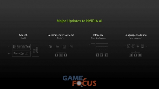 개발자가 자유롭게 이용할 수 있는 엔비디아 AI에는 음성 AI용 엔비디아 리바(NVIDIA Riva)와 스마트 추천용 엔비디아 메를린(NVIDIA Merlin)이 포함되어 있다. 이 두 제품 모두 현재 정식 출시된 상태다. 또한 엔비디아 트리톤(NVIDIA Triton), 니모(Nemo), 맥신(Maxine) 및 타오 툴킷(TAO Toolkit)과 같은 도구를 포함하여 소프트웨어 제품군 전반에 걸쳐 업데이트가 이루어졌다.