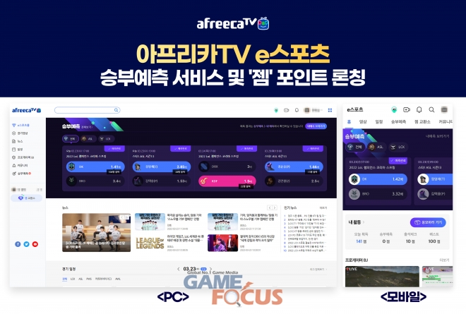 아프리카TV는 '리그 오브 레전드 챔피언스 코리아(League of Legends Champions Korea, 이하 LCK)', '아프리카TV 스타리그 (AfreecaTV StarCraft League, 이하 ASL)' 등 e스포츠 경기에 대해 승부를 예측하고 결과에 따라 포인트(이하 젬)를 획득할 수 있는 신규 서비스를 론칭했다고 밝혔다.