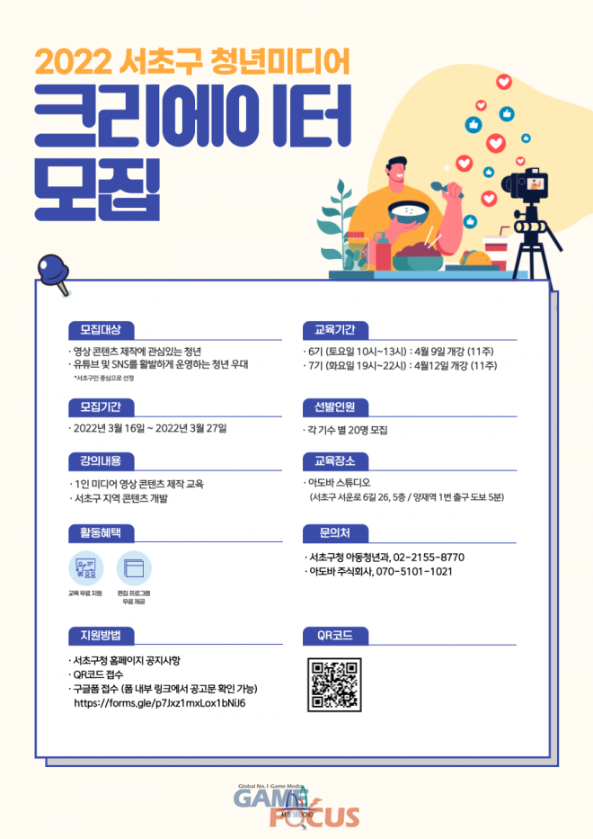 중국 전문 크리에이터 콘텐츠 플랫폼 아도바가 서초구와 함께 3월 16일부터 27일까지 서초구 미디어 크리에이터 과정 수강자를 모집한다.