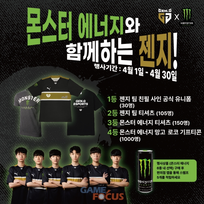 몬스터 에너지는(Monster Energy)는 28일, 4월까지 약 한 달 동안 젠지 이스포츠(Gen.G Esports, 이하 젠지) 롤팀과 함께 하는 2개의 이벤트를 진행한다고 밝혔다.