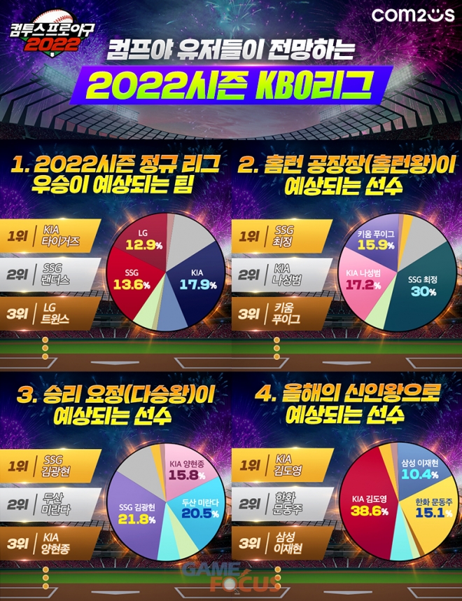 이번 설문은 한국 프로야구의 40주년, 김광현과 양현종 등 최고 투수들의 국내 복귀, 유관중 전환 등 유달리 볼거리가 많을 것으로 예상되는 '2022 KBO'의 개막을 맞아, '컴프야2022'를 즐기면서 야구 시즌을 기다리는 유저들에게 새 시즌에 대한 기대감을 높이기 위해 마련됐다. 약 2만여 명의 공식카페 유저들이 참여한 가운데 정규리그 우승팀과 홈런왕, 다승왕, 신인왕 등 주요 타이틀을 예상했다.