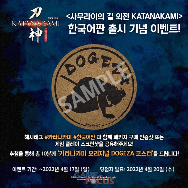 '사무라이의 길 외전 KATANAKAMI' 한국어판의 출시를 기념하여, 자신의 SNS에 게임의 구매 인증샷 또는 플레이 스크린샷을 업로드하여 참여하면, 추첨을 통해 ‘카타나카미 오리지널 DOGEZA 코스터’를 증정하는 이벤트가 오늘부터 실시된다. 이벤트에 대한 자세한 내용은 다음과 같다.