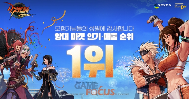 ㈜넥슨(대표 이정헌)의 ‘던전앤파이터 모바일(이하 던파모바일)’이 지난 1일 구글 플레이와 애플 앱스토어에서 인기 및 매출 순위 1위에 모두 올랐다.