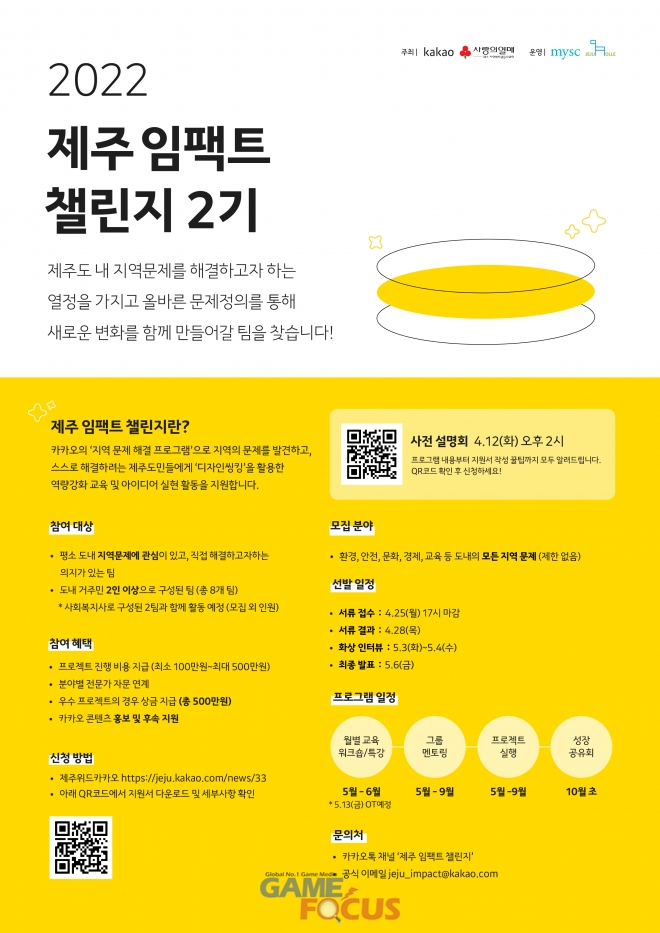 카카오(대표 남궁훈)가 제주사회복지공동모금회(회장 강지언)과 함께하는 제주도민 주도형 지역문제 해결 프로그램 ‘제주 임팩트 챌린지 2기’ 참가 팀을 모집한다고 4일 밝혔다.
