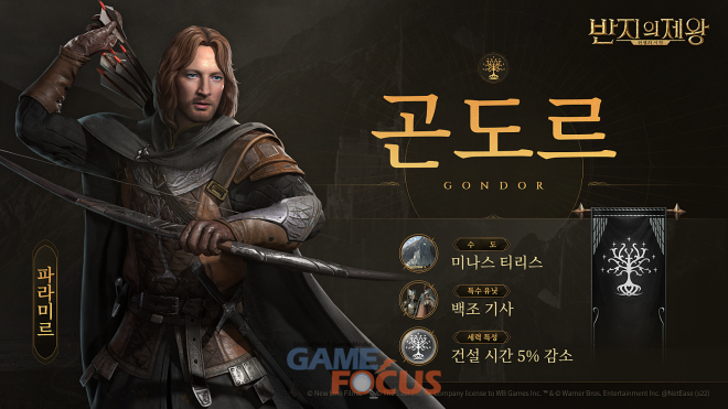 중간계 남쪽에 위치한 돌의 땅 '곤도르’를 선택하면 미나스 티리스에서 영웅 '파라미르'로 시작하게 된다. 곤도르는 '건설 시간 5% 감소’ 특성을 가지고 있어 남들보다 먼저 건물들을 건설하여 우위를 점할 수 있다. 또한 특수 유닛인 '백조 기사’를 사용해 상대 세력을 빠르게 무너뜨릴 수 있다. 정의의 편에서 악에 맞서 싸우고 싶다면 곤도르는 최고의 선택이 될 수 있다.