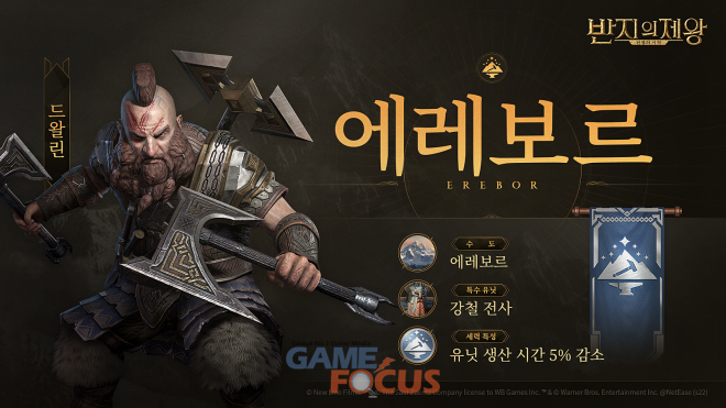 두린족 난쟁이들의 고향 '에레보르’를 선택하면 에레보르에서 영웅 '드왈린’으로 시작하게 된다. 에레보르는 '유닛 생산 시간 5% 감소’ 특성을 가지고 있어 누구보다 먼저 이득을 챙길 수 있다. 또한 강력한 무기로 무장한 특수 유닛인 '강철전사’를 통해 누구보다 단단하게 내 세력을 보호할 수 있다. 강력한 장비를 원한다면 에레보르가 최고의 선택이 될 수 있다.