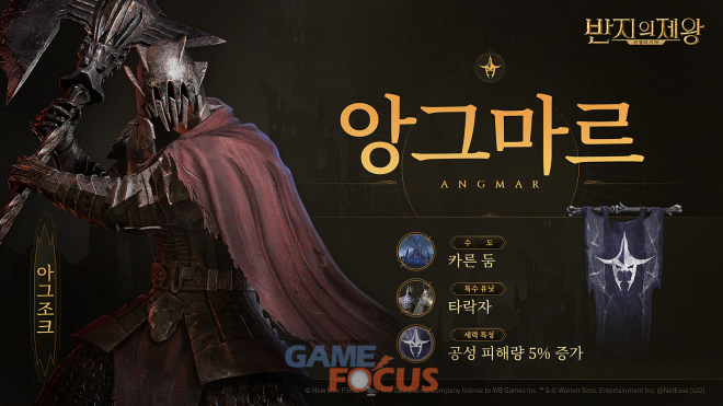 앙그마르의 마술사 왕이 건국한 강철 감옥이라 불리는 '앙그마르’를 선택하면 카른 둠에서 영웅 '아그조크’로 시작하게 된다. 앙그마르는 '공성 피해량 5% 증가’ 특성이 있어 누구보다 상대 세력을 빠르게 함락시킬 수 있다. 또한 특수 유닛 '타락자’로 사우론 휘하의 가장 강력한 군대를 이끌 수 있다. 강력한 악의 세력을 이끌어 세상을 정복하고 싶다면 앙그마르가 최고의 선택이 될 수 있다.