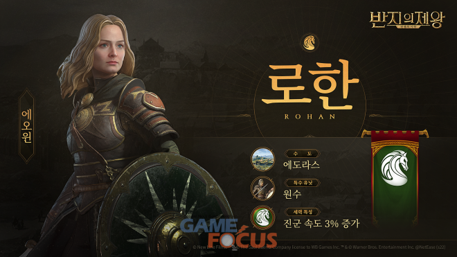 곤도르의 북쪽에 있는 드넓은 평야와 말을 타고 순찰하는 로히림으로 유명한 '로한’을 선택하면 에도라스에서 영웅 '에오윈’으로 시작하게 된다. 로한은 '진군 속도 3% 증가’ 특성이 있어 최단시간에 세력을 확장할 수 있다. 또한 특수 유닛인 '원수’를 통해 강력한 기병으로 세력전쟁에 참여할 수 있다. 드넓은 평야에서 강력한 기병으로 세상을 정복하고 싶다면 로한이 최고의 선택이 될 수 있다.