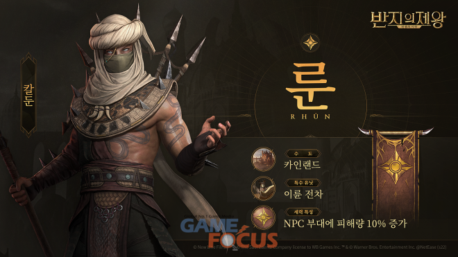 중간계 동부 미지의 사막 지역에 위치한 '룬’을 선택하면 카인랜드에서 영웅 '칼둔’으로 시작하게 된다. 룬은 'NPC 부대에 피해량 10% 증가’ 특성이 있어 육성한 영웅끼리 싸움에서 압도적인 힘을 보여준다. 또한 특수 유닛인 '이륜 전차’를 통해 상대 세력에 큰 위협을 줄 수 있다. 강력한 전차군단을 몰아 세상을 정복하고 싶다면 룬은 최고의 선택이 될 수 있다.