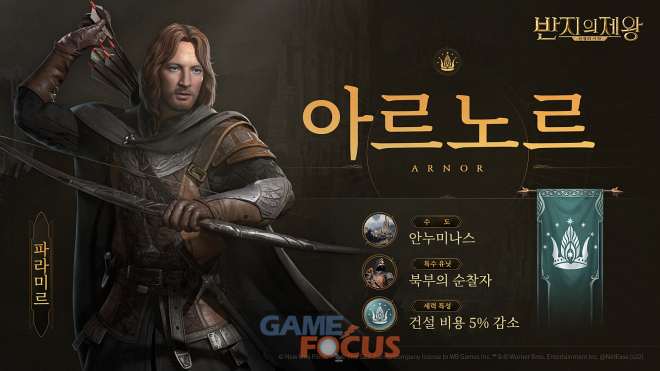 중간계 북쪽에 자리한 두네다인 왕국 '아르노르’를 선택하면 안누미나스에서 영웅 '파라미르’로 시작하게 된다. 아르노르는 '건설 비용 5% 감소’ 특성이 있어 누구보다 저렴하게 내 세력을 확장할 수 있다. 또한 특수 유닛 '북부의 순찰자’를 통해 다른 세력의 정보를 빠르게 알아낼 수 있다. 정의로운 왕국을 이끌고 싶다면 아르노르가 최고의 선택이 될 수 있다.