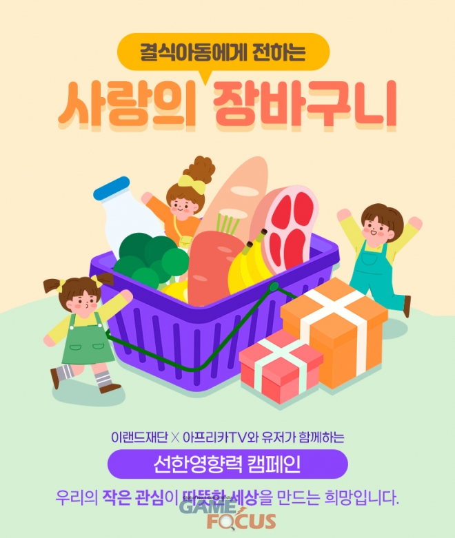아프리카TV는 7일(목) 결식아동에 대한 사회적 관심을 높이기 위해 이랜드재단·BJ(Broadcasting Jockey, 1인 미디어 진행자)·유저와 함께하는 '사랑의 장바구니' 캠페인을 전개한다고 밝혔다.