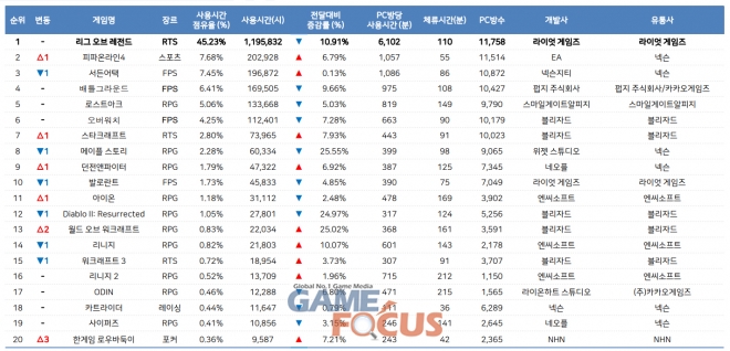 이 외에도 10위권 내에서 가장 눈에 띄는 게임은 ’피파온라인4’로 지난 달 대비 PC방 사용량이 6.79%증가하며, 전체 게임 중 7.68%의 점유율을 기록 1계단 상승한 2위를 기록하였다. ‘스타크래프트’도 지난 달 대비 사용량이 7.93% 증가하며 8위에서 7위로 1계단 상승하였다.