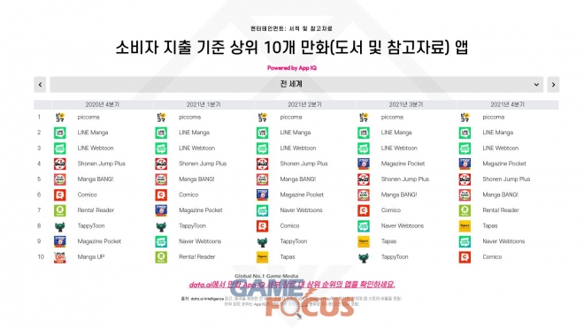 데이터 및 분석 플랫폼 data.ai(구. 앱애니)가 이달 5일 발표한 ‘2022년 모바일 미디어 및 엔터테인먼트 현황 보고서’에 따르면 픽코마는 전 세계만화(도서 및 참고자료) 앱 부문에서 소비자 지출이 많은 상위 앱 랭킹 1위를 꾸준히 유지 중인 것으로 나타났다. 2016년 4월 일본에서 첫 선을 보인 픽코마는 2020년 7월 처음 전세계 만화 앱 매출 1위를 차지하고 지금까지 자리를 지키고 있다.